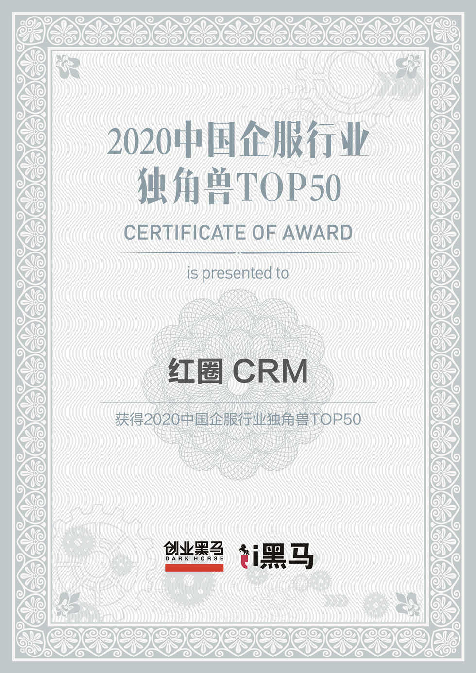 經(jīng)過多輪線上綜合評審會和最終角逐,紅圈CRM 作為 CRM 領(lǐng)域唯一代表企業(yè)入選《2020 中國企服行業(yè)獨(dú)角獸 TOP50》,該榜單在 12 月 18 日創(chuàng)業(yè)黑馬主辦的的第十三屆創(chuàng)業(yè)家年會上隆重發(fā)布。