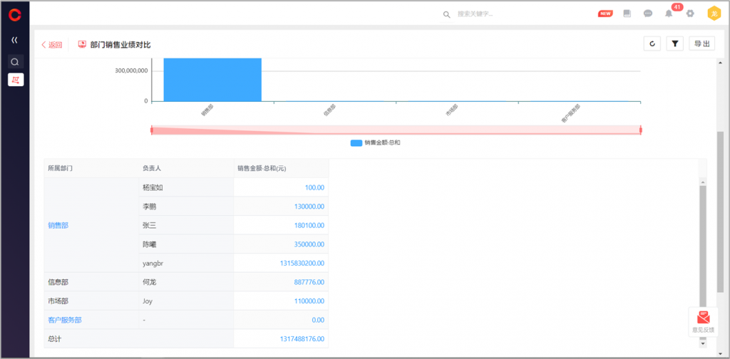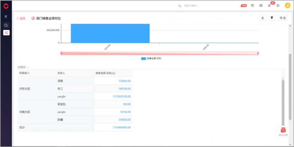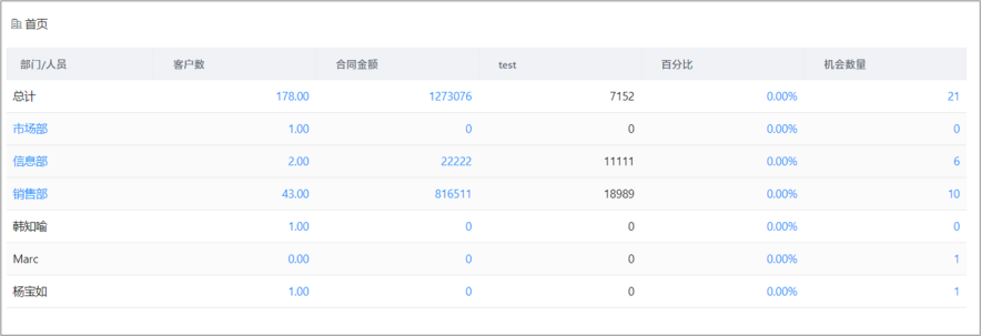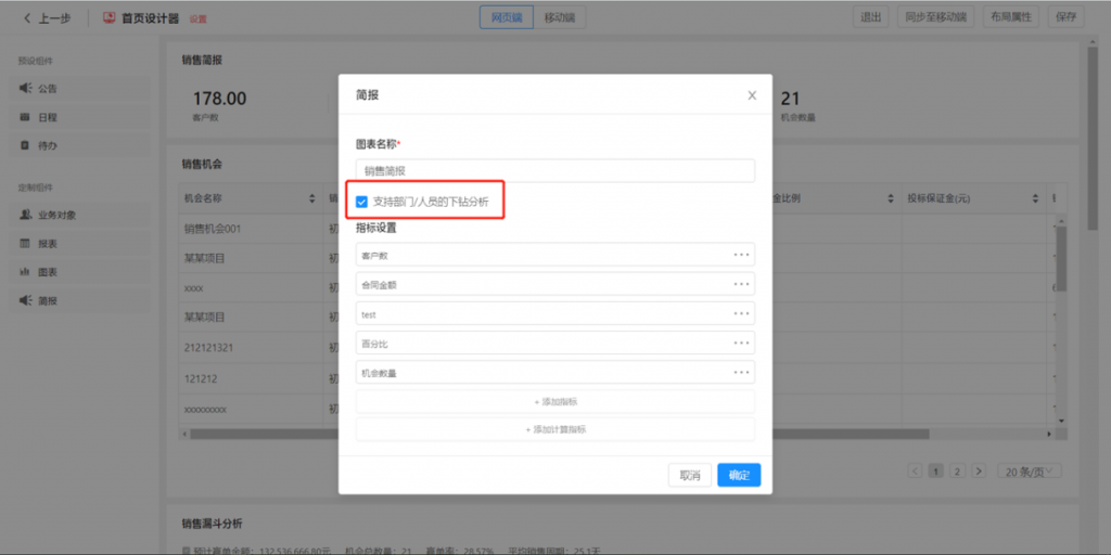 部門/人員鉆取分析:簡報(bào)組件可開啟“支持部門/人員下鉆分析”,開啟后,在簡報(bào)查看時,可點(diǎn)擊進(jìn)入分析報(bào)表,以數(shù)據(jù)負(fù)責(zé)人為依據(jù),按照部門/人員的逐級鉆取查看指標(biāo)在各部門及員工的分布情況