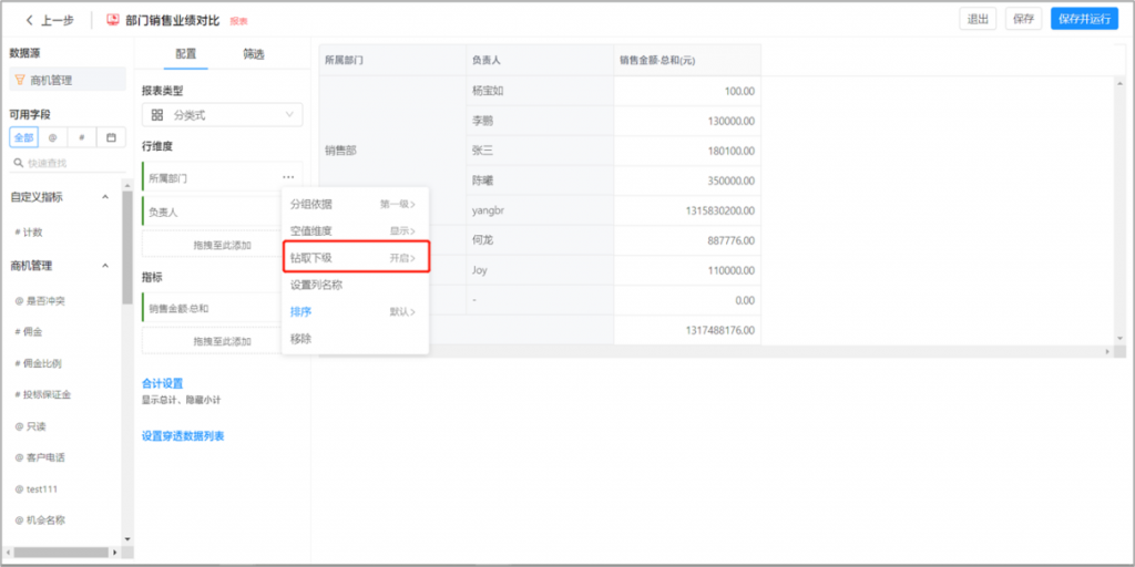 自定義報(bào)表支持部門下鉆:當(dāng)以部門為維度時,可開啟部門下鉆,逐級查看下級部門的分析數(shù)據(jù)