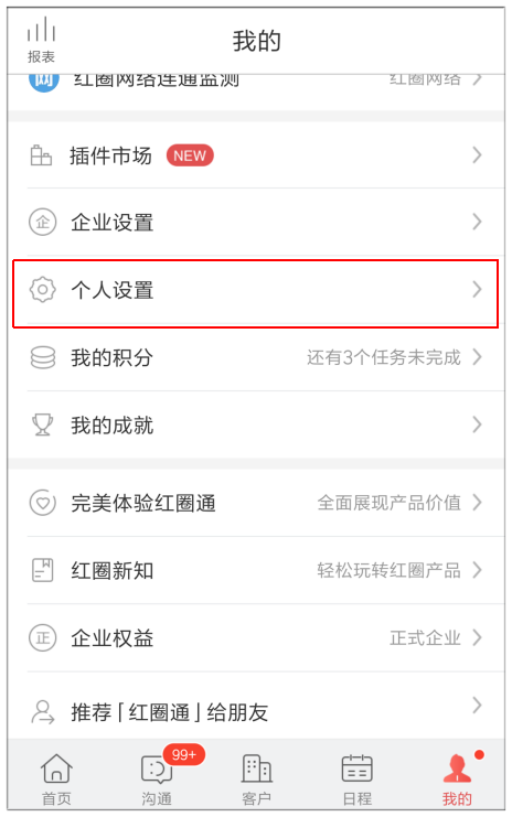 首先,打開紅圈通,進(jìn)入【我的】,然后下拉屏幕點擊【個人設(shè)置】;