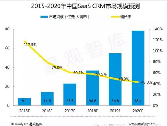 報(bào)告指出,國內(nèi)SaaS CRM市場在2014年的增長率達(dá)到了176.9%,市場規(guī)模從1.3億元人民幣增長到了3.7億元人民幣,2015年的增長率預(yù)計(jì)達(dá)到117.5%,市場規(guī)模增長到8.1億元人民幣。2015-2020年市場還會保持較高速度增長,但是隨著市場規(guī)模的逐漸擴(kuò)大,增長將趨于平穩(wěn),中國傳統(tǒng)中小企業(yè)的互聯(lián)網(wǎng)化轉(zhuǎn)型將成為市場規(guī)模增長的主要動力,而隨著中國傳統(tǒng)中小企業(yè)互聯(lián)網(wǎng)化轉(zhuǎn)型的逐漸完成,SaaS CRM市場的企業(yè)數(shù)量將保持在一個(gè)平穩(wěn)的水平,市場的規(guī)模增長將來源于更加專業(yè)以及更加多元化的產(chǎn)品服務(wù)。