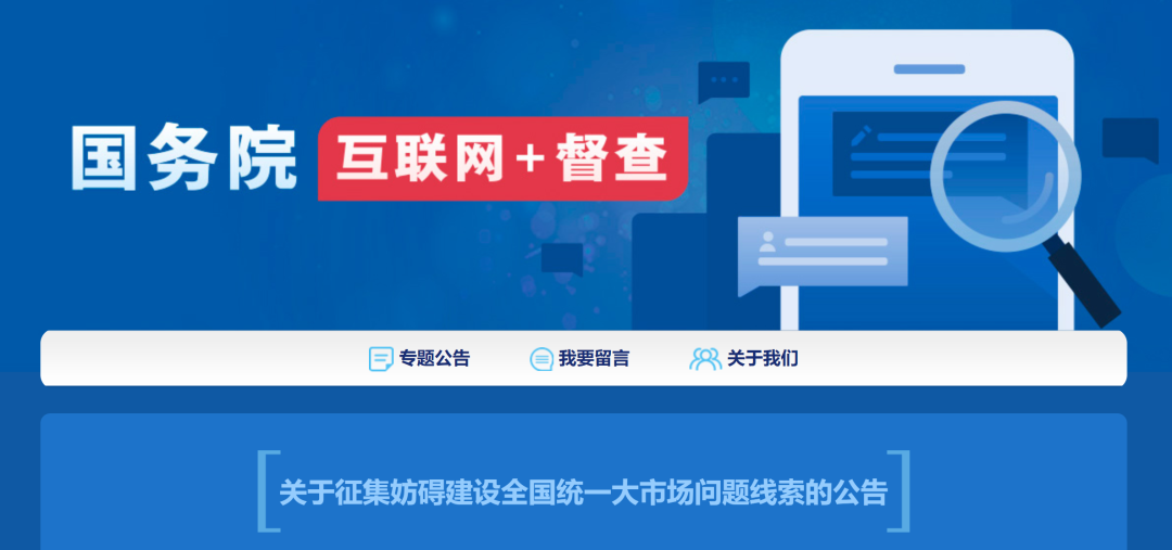 9月25日,國務(wù)院辦公廳發(fā)布《關(guān)于征集妨礙建設(shè)全國統(tǒng)一大市場問題線索的公告》。公告明確,為貫徹落實(shí)《中共中央 國務(wù)院關(guān)于加快建設(shè)全國統(tǒng)一大市場的意見》,推動解決妨礙建設(shè)全國統(tǒng)一大市場的突出問題,國務(wù)院“互聯(lián)網(wǎng)+督查”平臺從即日起面向社會征集七個方面的問題線索和意見建議:
