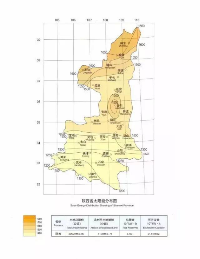 陜西省具有豐富的太陽(yáng)能資源,太陽(yáng)能資源空間分布特征是北部多于南部,全省太陽(yáng)能年總輻射量在4410~5400MJ/m2之間。初步推算,陜西的太陽(yáng)能資源經(jīng)濟(jì)技術(shù)可開(kāi)發(fā)量大約1.1億千瓦。