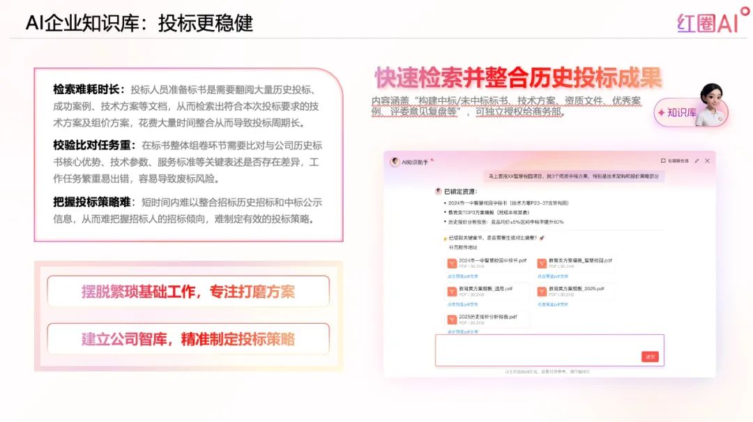 AI企業(yè)知識(shí)庫可秒級(jí)檢索并整合歷史標(biāo)書、技術(shù)方案、評(píng)委意見等資料,形成智能化投標(biāo)策略,減少人工檢索時(shí)間,提升投標(biāo)成功率。
