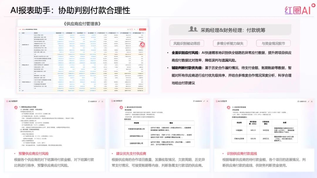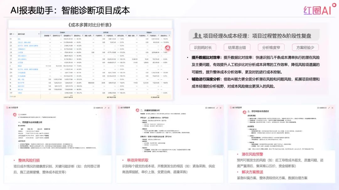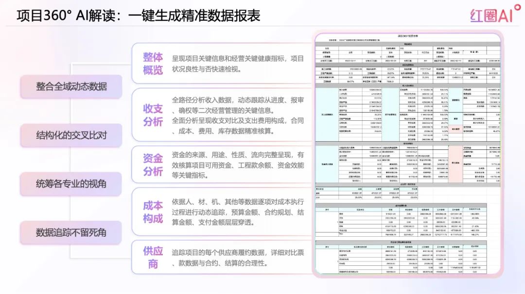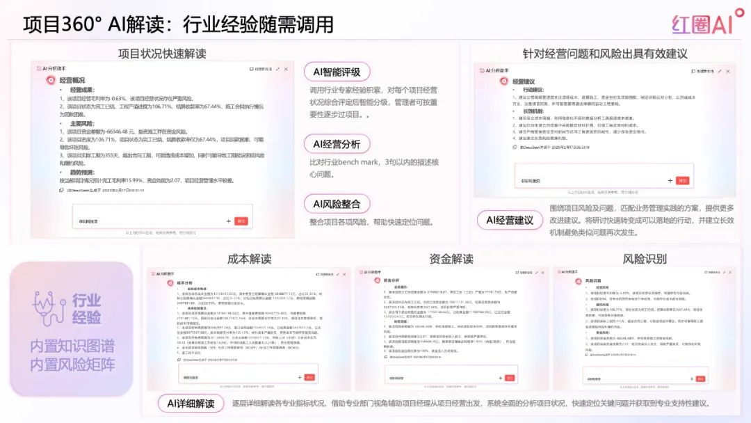 項(xiàng)目360°AI解讀功能可實(shí)時(shí)整合資金、成本、合同、付款等數(shù)據(jù),自動(dòng)生成可視化分析報(bào)告和風(fēng)險(xiǎn)預(yù)警,幫助企業(yè)更好地應(yīng)對(duì)政府對(duì)“全過程留痕”的監(jiān)管要求。